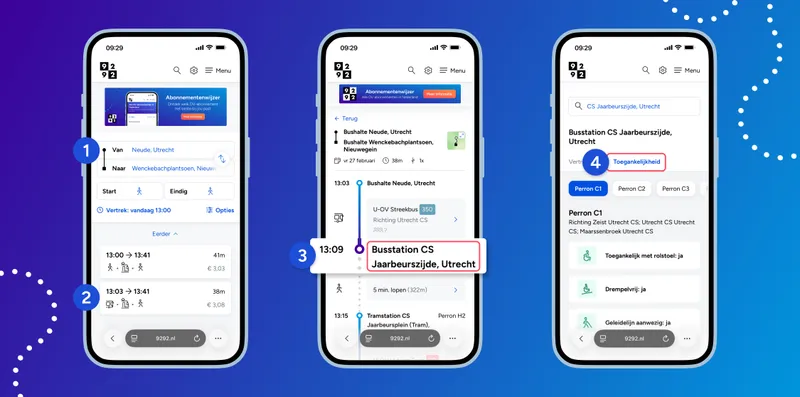 Ben je benieuwd naar de toegankelijkheid van de haltes waar je tijdens jouw reis langs komt? Op de website van 9292 zie je per halte de volgende gegevens: