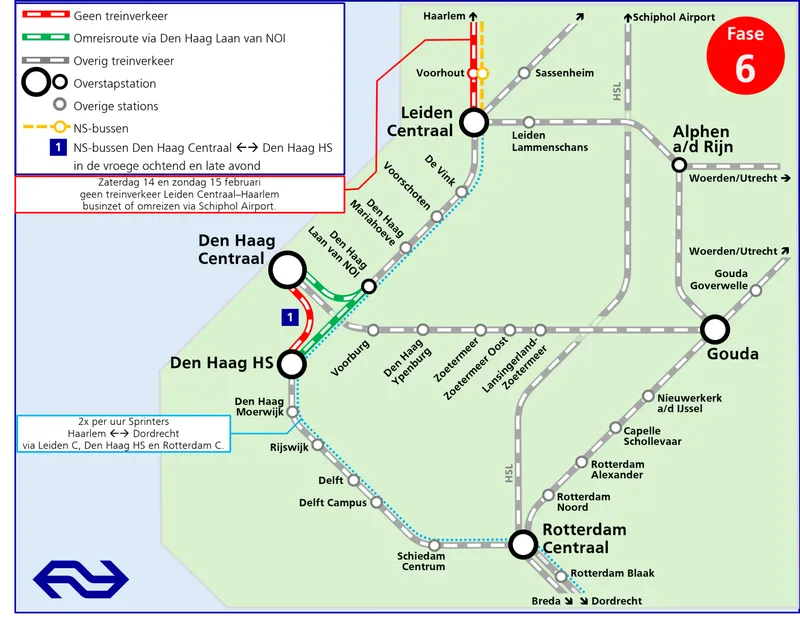 Let op – Op 14 en 15 februari rijden er ook geen treinen tussen Leiden Centraal en Haarlem. Lees meer over de werkzaamheden rondom Leiden.