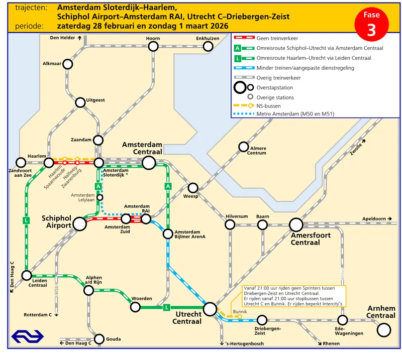 Van 24 februari t/m 1 maart rijden er geen treinen tussen Amsterdam Sloterdijk en Haarlem. Op 28 februari en 1 maart rijden er geen treinen van en naar Amsterdam Zuid.