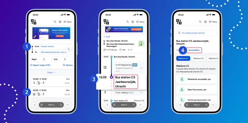 Is a stop accessible for wheelchairs? Is the access to the stop step-free? Is there tactile guidance paving present? You can now look up this information on the 9292 website.