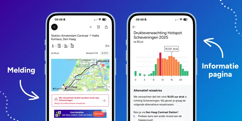 Plan je een reis naar Scheveningen en komt de voorspelde drukte boven een bepaalde drempel uit? Dan krijg je bij het opvragen van een reisadvies een melding te zien over de voorspelde drukte. In de afbeelding hieronder zie je hoe de melding eruit ziet in het reisadvies.