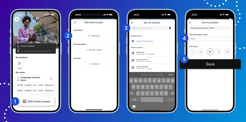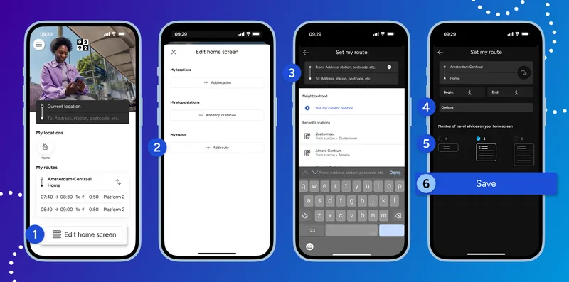 With your favourite routes, you will immediately see the next travel advice options for this route on your home screen. Do you want to set this up? Then follow the steps below.