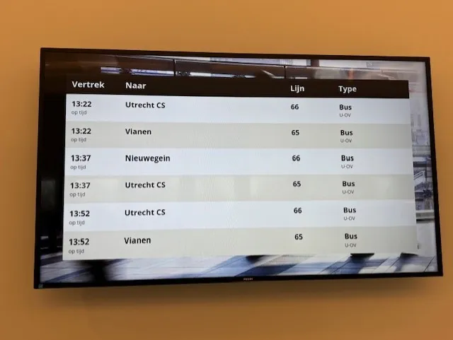 Met de Vertrekwijzer ziet jouw bezoeker direct of die rustig aan kan doen of juist een sprintje moet trekken naar de halte of het station. Ook zien ze op het scherm of er een rit uitvalt of vertraagd is. Dit is niet alleen een extra service voor jouw bezoekers, maar ook voor de eigen medewerkers. En daarnaast levert het je 1 punt op voor de BREEAM Certificering.