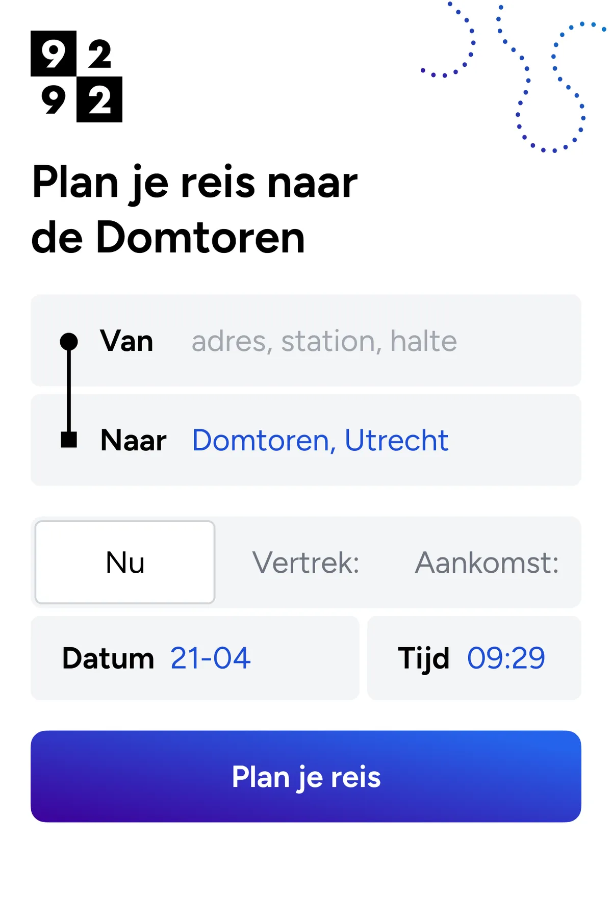 Hiernaast zie je een voorbeeld van de 9292 Reisplanner Widget.